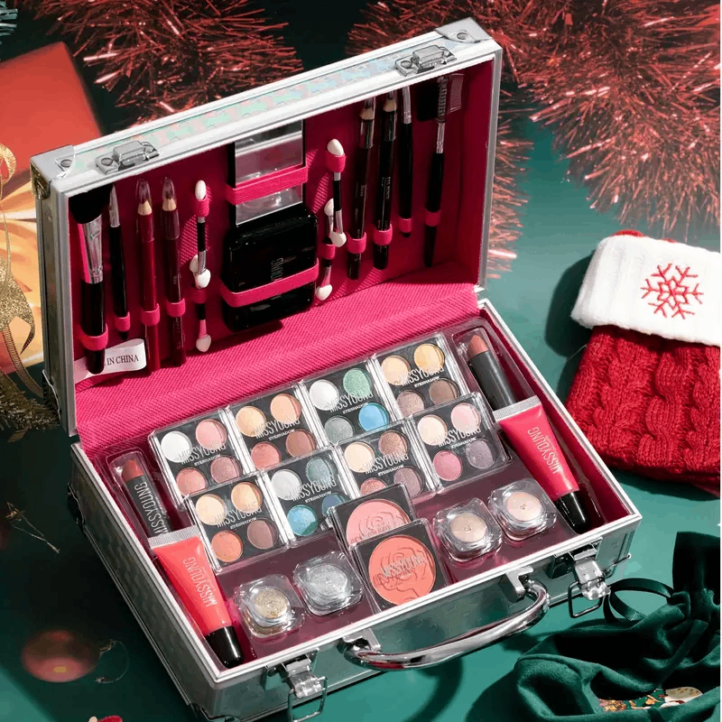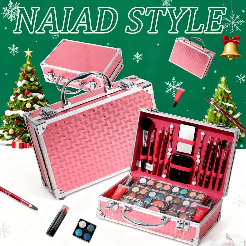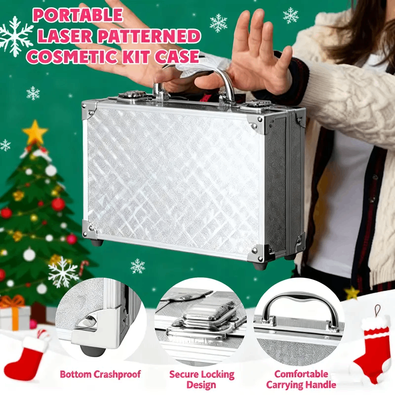 Portable Makeup Case, All-In-One Makeup Set, Glamorous Pink And Silvery, Storage Box, Eye Shadow, Lip Gloss, Lip Liner, Blush, Sequined Eyebrow Pencil With Mirror,