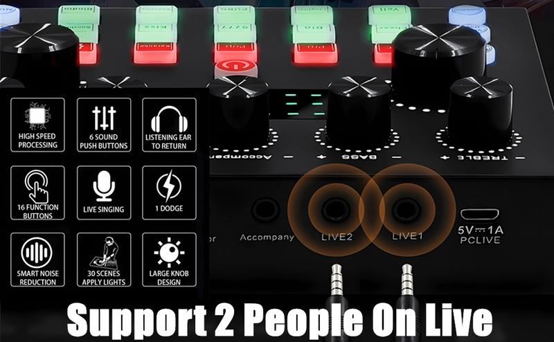 V8S Podcast Equipment Bundle with Multiple Sound Effects and Voice ChangerPowerful FunctionThe V8S audio interface mixer has 4 sound variations(Female、Male、Child and Monster)and can produce 10 sound effects.These sound effects add more fun to your live streaming. Powerful two-Core DSP chip, with stable signal, nice sound quality and without delay. The unique display screen design allows you to watch the volume change at all times. In addition, the podcast mixer has 4 sound modes,13 functions.It contains almost all of the commonly used functions,which is designed for recording,podcasting,live streaming,ect.