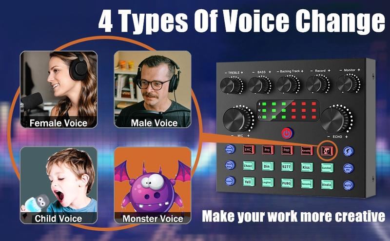 Rich sound effects & 4 Types of Voice ChangerThe V8S sound card has 4 sound variations (Female、Male、Child and Monster) and can produce 10 sound effects.These sound effects add more fun to your live streaming.It contains almost all of the commonly used functions, which is designed for recording,podcasting,live streaming,ect.