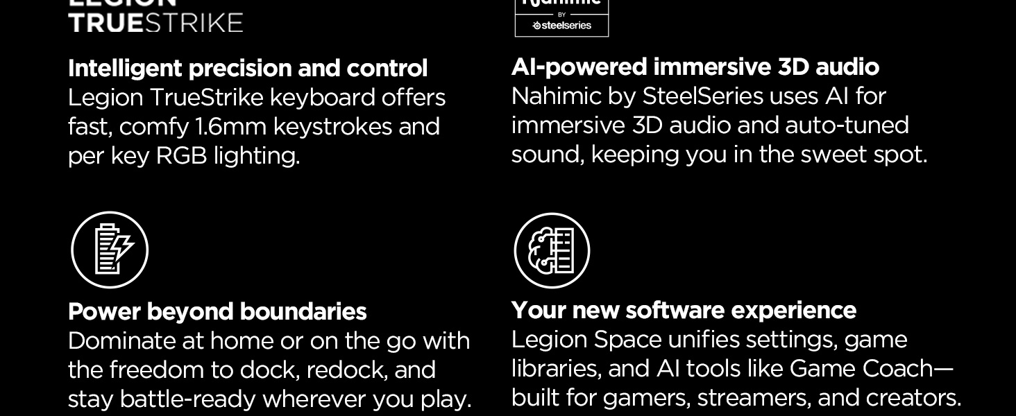 The Lenovo Legion Pro 7i is a true desktop replacement, designed for eSports grandmasters who also demand high FPS in AAA games. It's powered by an Intel® Core™ Ultra 9 275HX processor and NVIDIA® GeForce RTX™ 5070 Ti graphics to deliver elite performance. Legion Coldfront: Vapor combines turbo-charged fans with a 250W Vapor Chamber for peak cooling and reduced noise levels for a quieter gaming experience. Nahimic by SteelSeries leverages AI technology to deliver immersive 3D audio through four speakers to transform your gaming experience. Lenovo AI Engine+ optimizes performance in real time while the Lenovo PureSight OLED gaming display delivers fast refresh rates and low latency. Powered by Wi-Fi 7 (320MHz) for top-tier wireless gaming and incredible battery life, gaming on the go just got that much easier. Legion Space is a dynamic software suite preloaded on Lenovo gaming devices that offers AI-powered cross-device experiences. Manage settings, game libraries, and connect Legion accessories, all in one place. The Legion Pro 7i is built to support your peak performance, comfort, and focus for all your gaming aspirations.