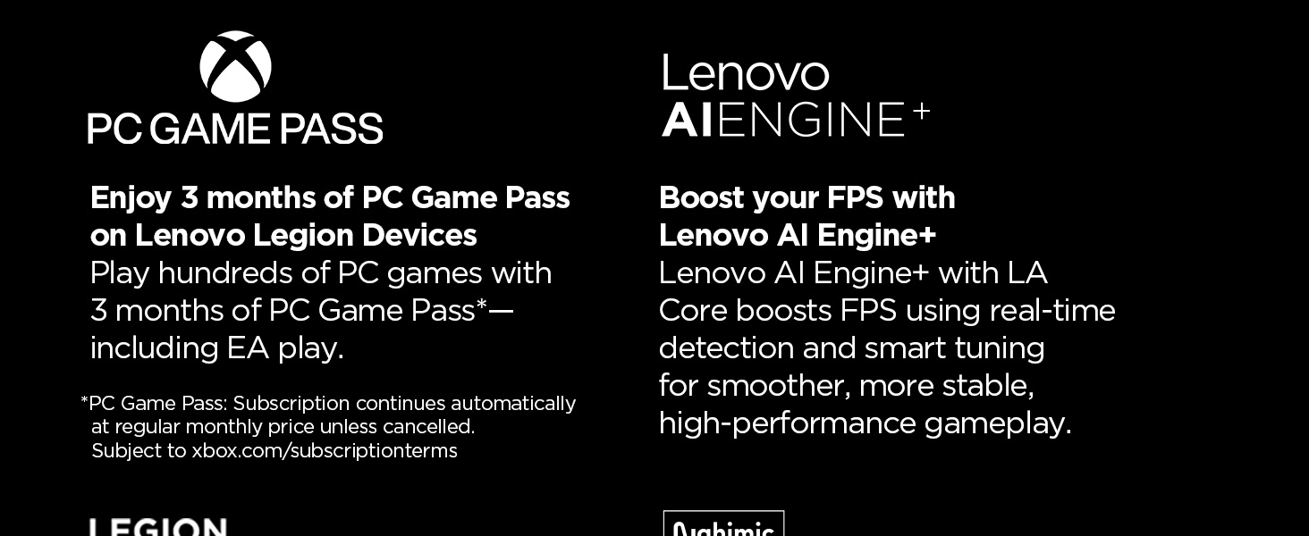 3 MONTHS OF PC GAME PASS – Play hundreds of high-quality PC games with your new Lenovo Legion device and 3 months of PC Game Pass, including EA Play. With new games added all the time, there’s always something new to play.